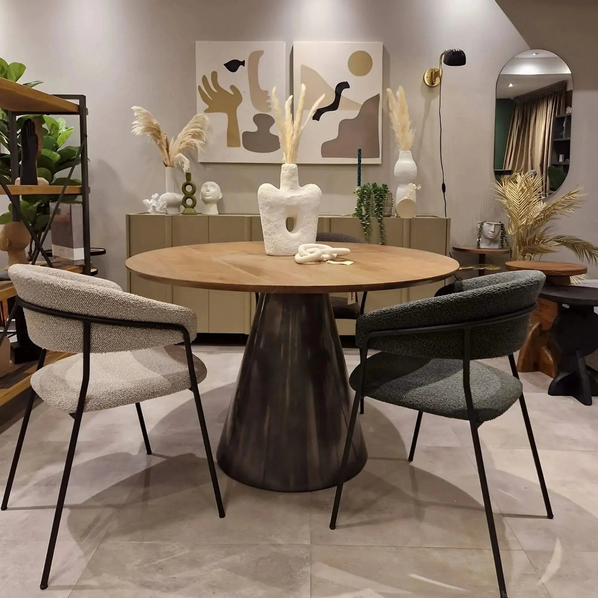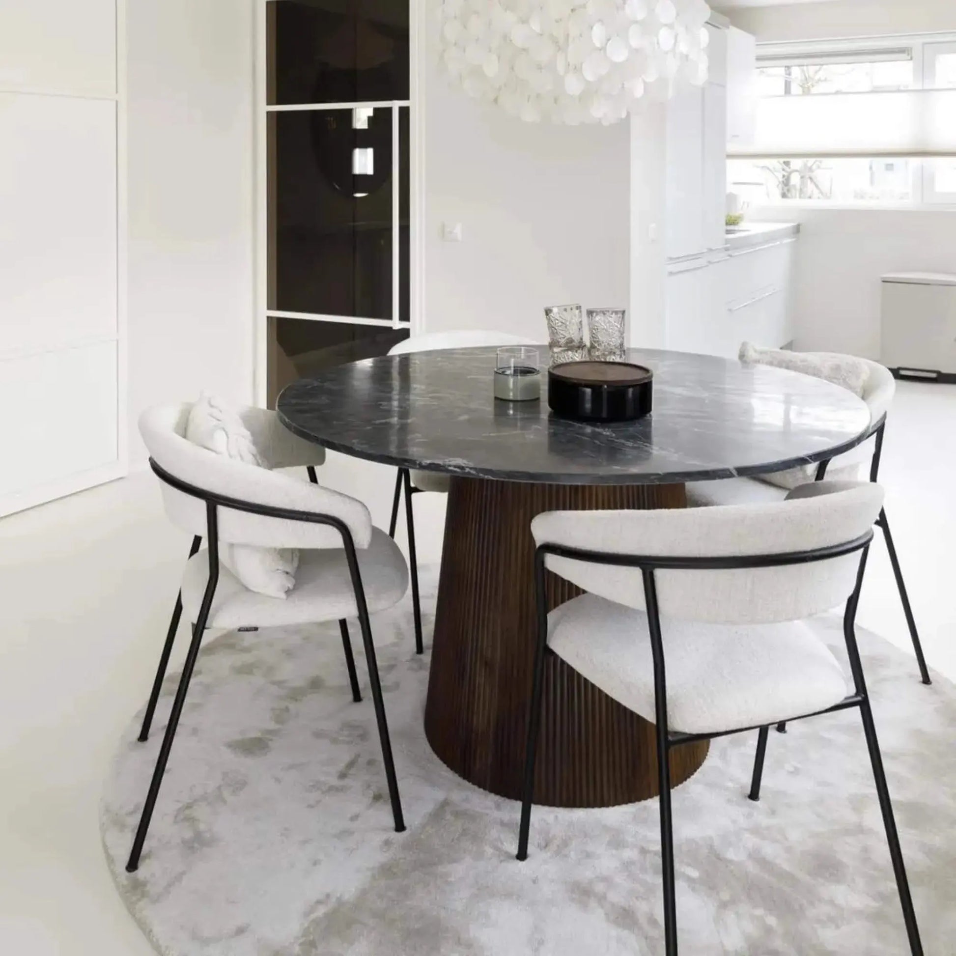 La base unique en métal assure la stabilité et confère à Jojo une esthétique moderne et raffinée. Son confort d’assise robuste en fait un choix idéal pour de longs repas en famille ou entre amis.