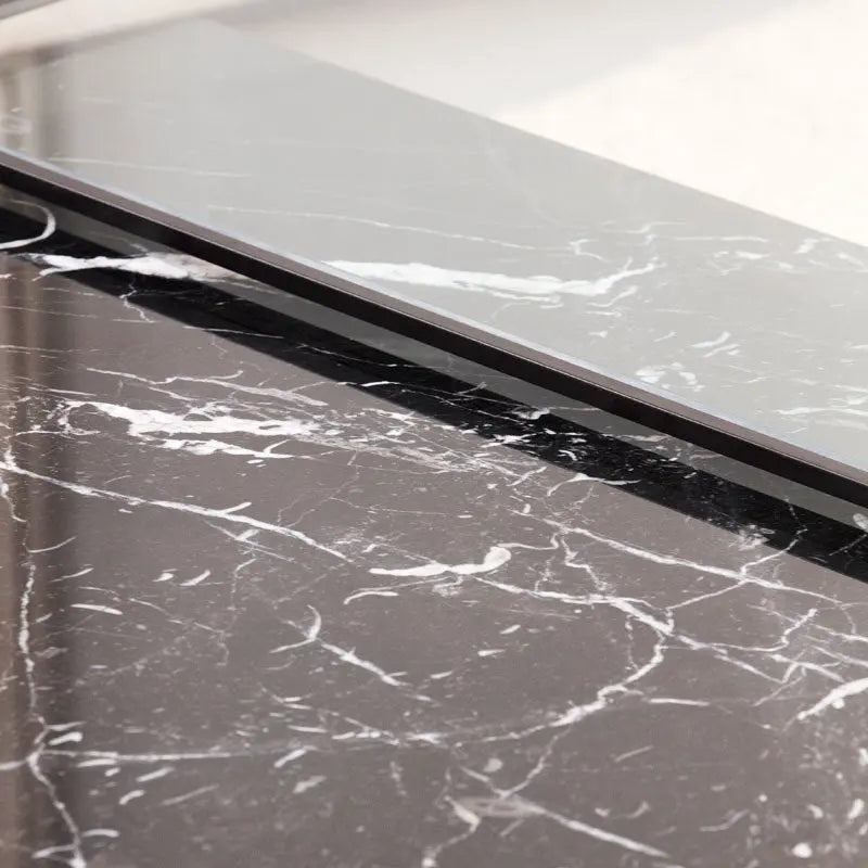 Matériaux de Qualité : Plateau en marbre noir, surface en verre transparent et cadre métallique noir.