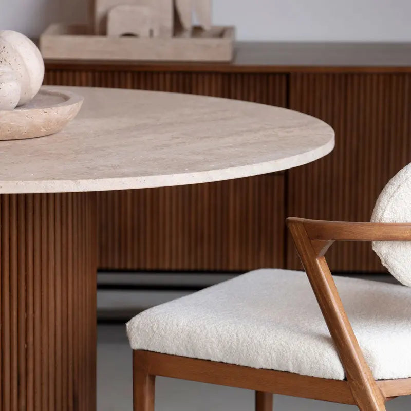 Les nuances naturelles de beige du travertin s'accordent facilement avec tous les styles et coloris de décoration. Chaque table, étant fabriquée à partir de matériaux naturels et de façon artisanale, est garantie unique.
