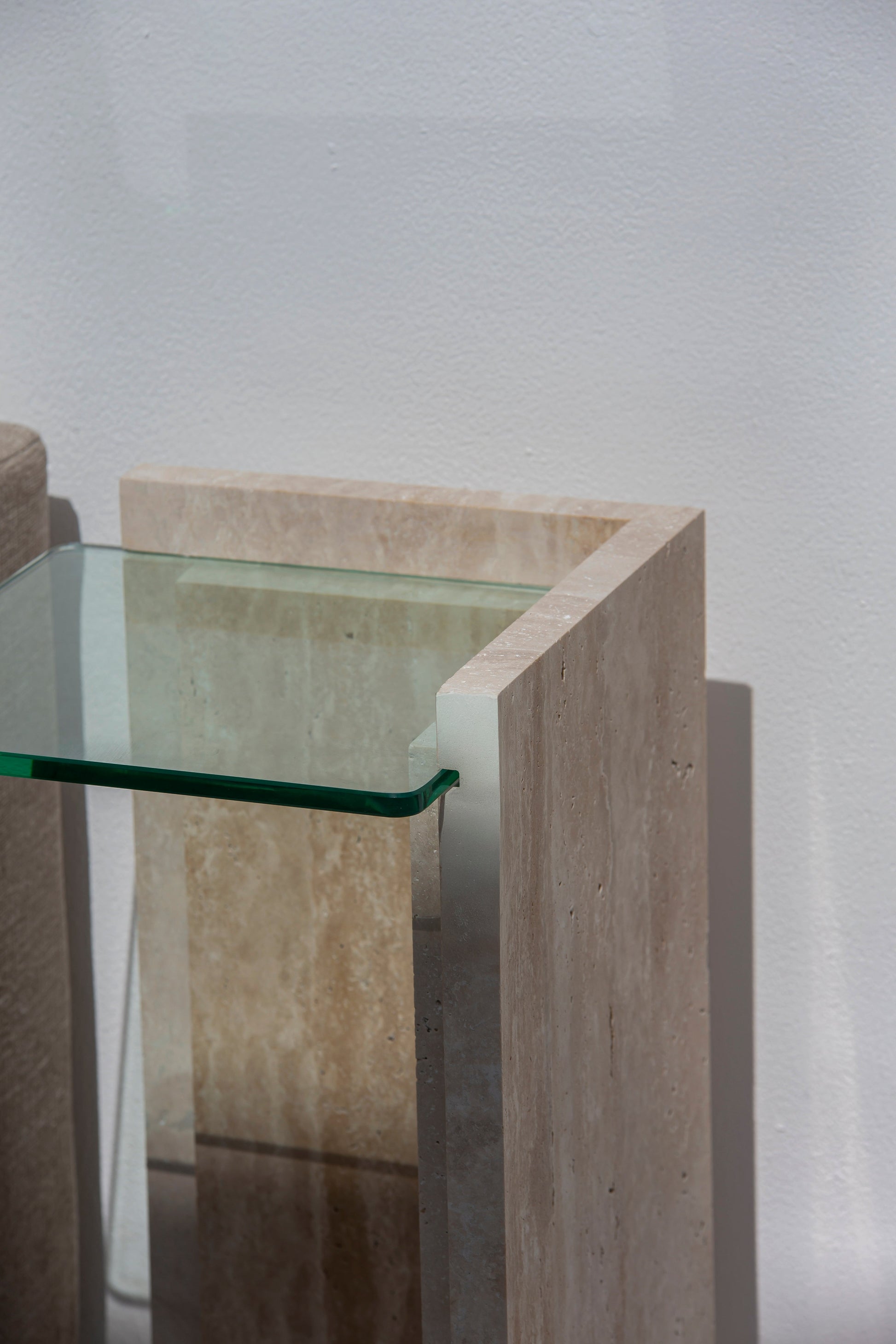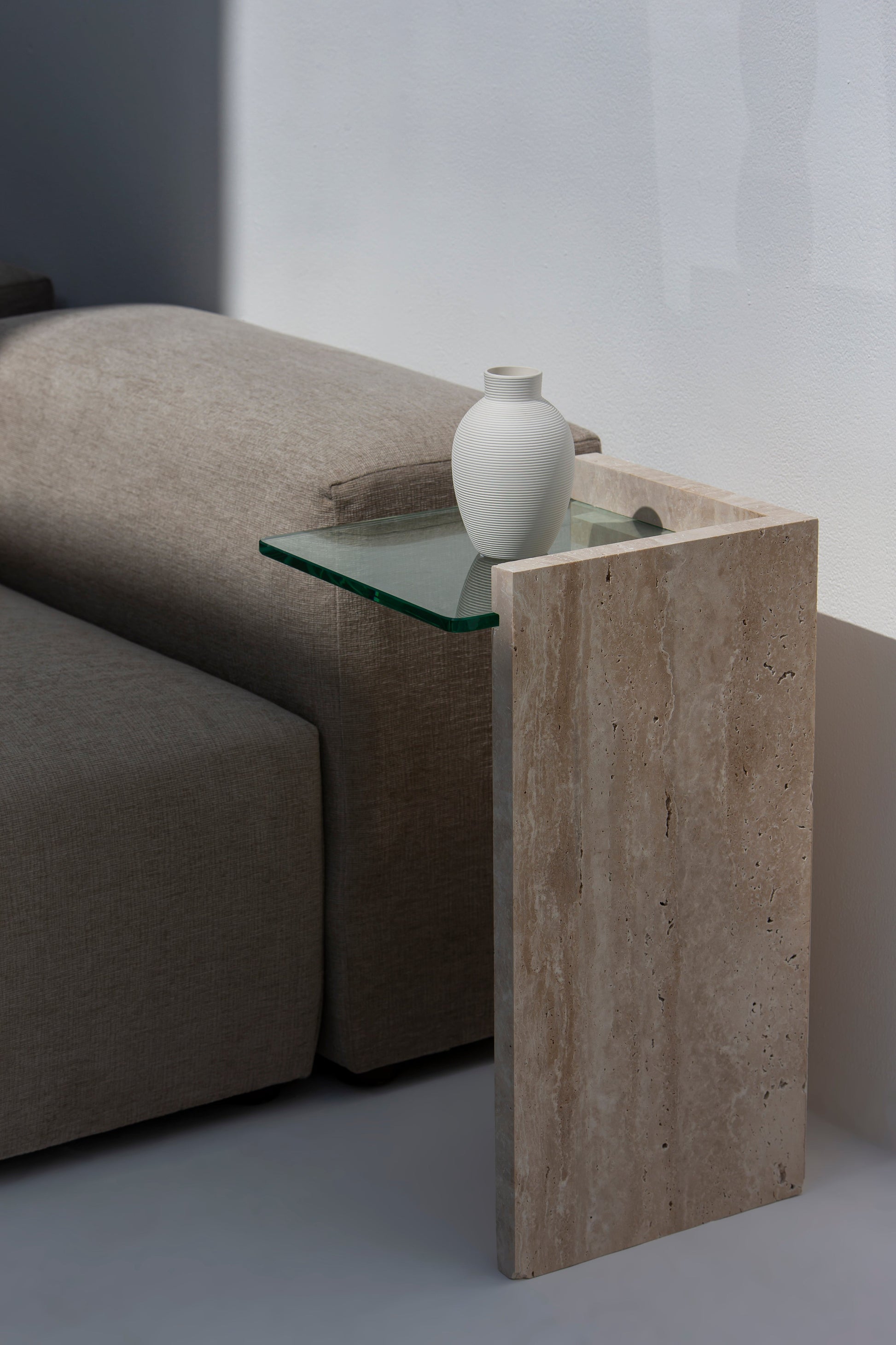 La table d’appoint Anise marie la force du travertin naturel à la légèreté d’un plateau en verre clair.