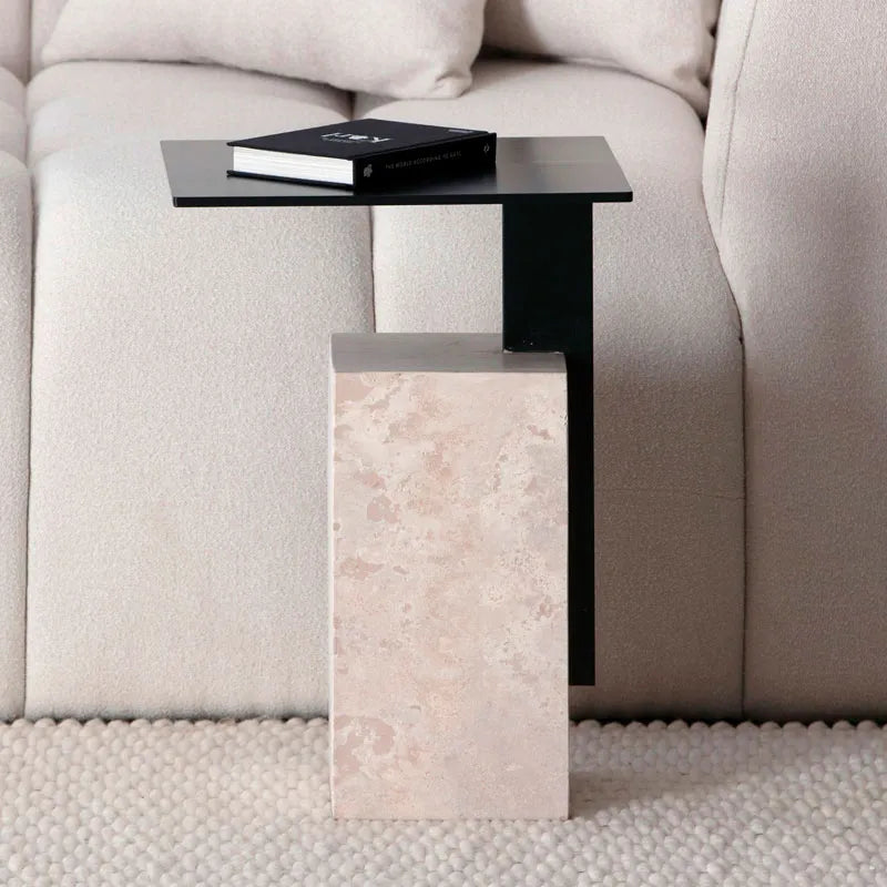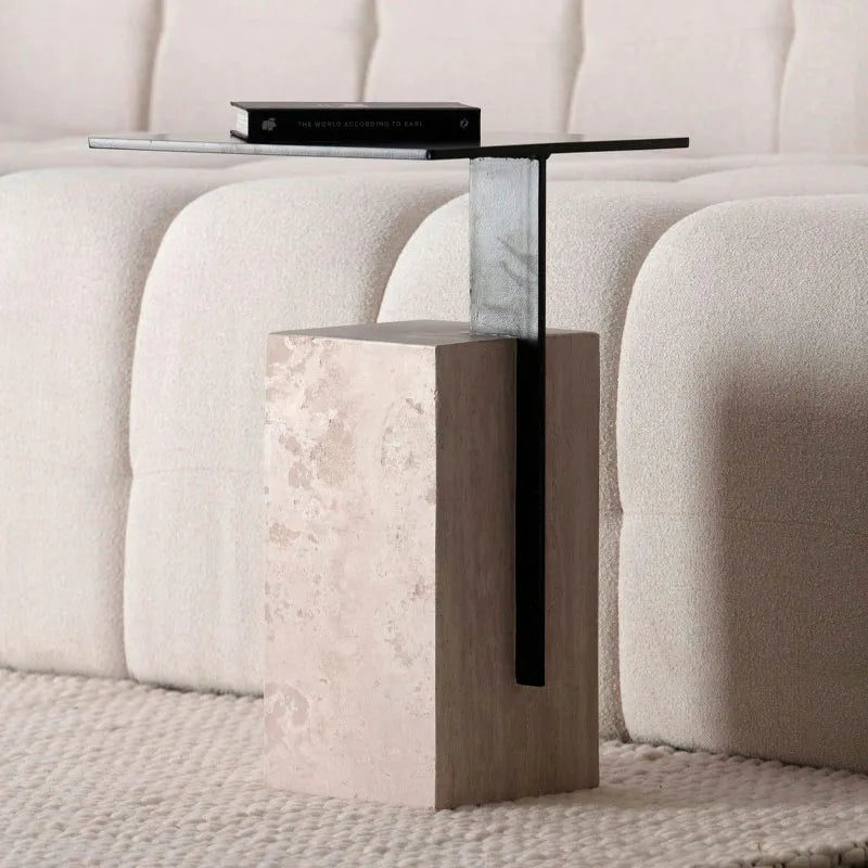 Minimaliste et sculpturale, Néro casse les codes avec son design en L inversé. Le contraste entre le travertin brut et la finesse du métal noir mat crée une pièce d’une rare intensité graphique.