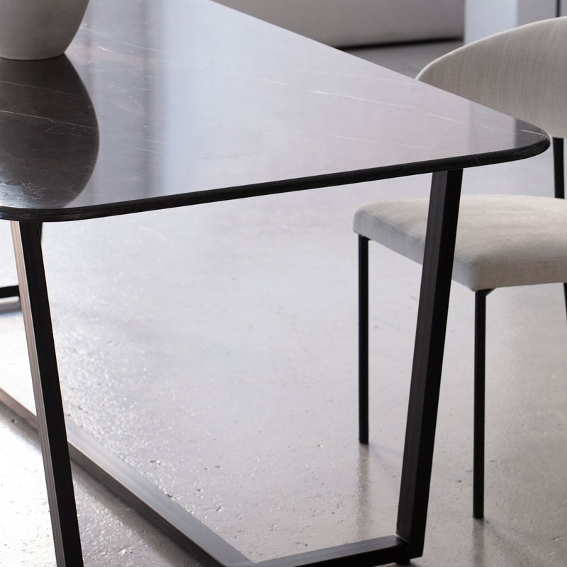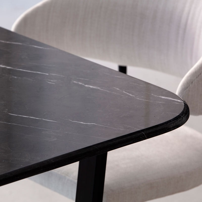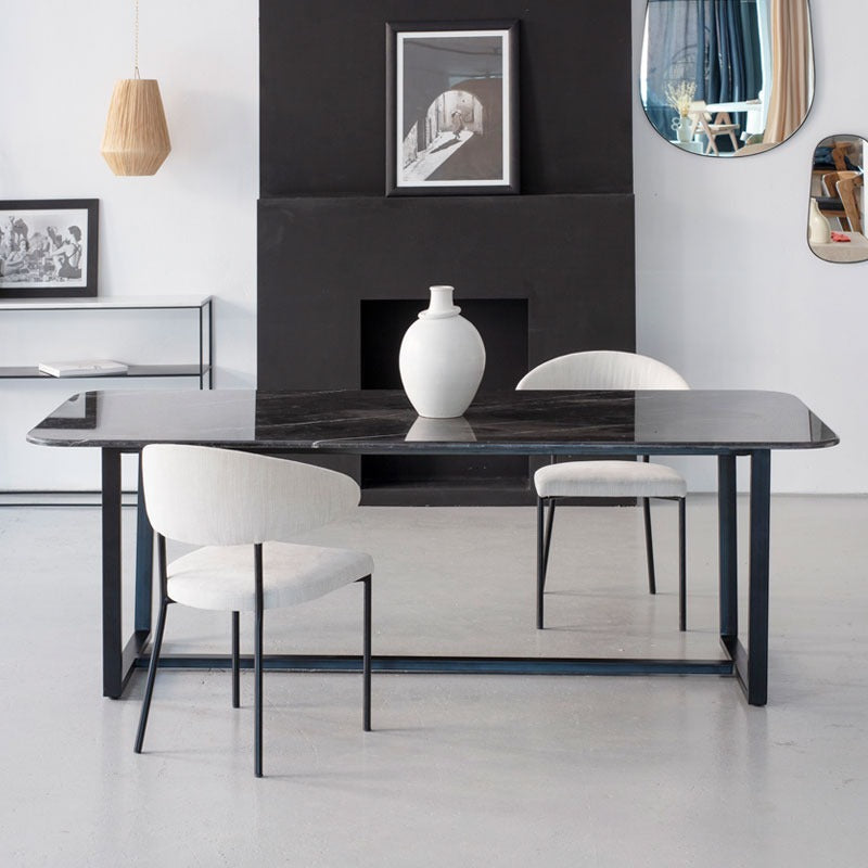 Le piétement en acier thermolaqué noir, solide et minimaliste, assure une stabilité parfaite tout en valorisant le caractère sculptural du plateau. Cette table est idéale pour accueillir famille et invités dans une ambiance à la fois conviviale et sophistiquée, adaptée aussi bien aux espaces modernes qu’aux intérieurs plus classiques.